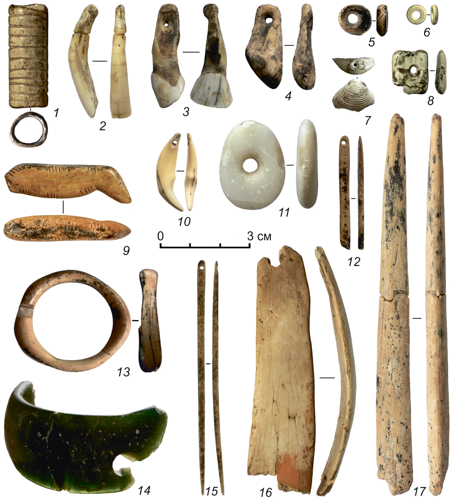 Ил. 3. Изделия из кости (1, 15, 17) и зубов (2–4, 10) животных, бивня мамонта (5, 9, 12, 13, 16), скорлупы яйца страуса (6), раковины моллюска (7) и поделочного камня (8, 11, 14) ранней стадии верхнего палеолита из Денисовой пещеры. 1 — пронизка; 2–4, 7, 10, 11 — подвески; 5, 6, 8 — бусины; 9 — зооморфная скульптура; 12, 15 — иглы; 13 — кольцо; 14 — браслет; 16 — диадема; 17 — остриё