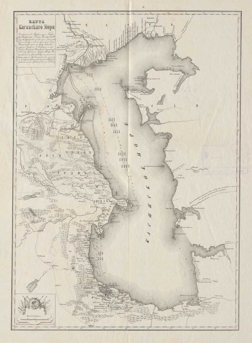 В качестве приложения к сборнику опубликованы исторические карты земель на западном берегу Каспийского моря, описание похода императора Петра Великого и его войск в Западный Прикаспий, карта Каспийского моря, составленная капитанами флота К. Верденом и Ф. Соймоновым, планы крепостей, военных сооружений, гаваней. Составленные военными инженерами и картографами XVIII в. исторические карты, планы и чертежи крепостей, укреплений и гаваней являются ценнейшими источниками для изучения кавказско-каспийского вектора внешней политики Российской империи Петровской эпохи. Среди них особую ценность представляет военно-исторический плакат 1779 г. «Описание похода государя императора Петра Великого к лежащим при Каспийском море персидским провинциям», иллюстрированный планами прикаспийских городов, крепостей и картой Каспийского моря. В.В. Комаров [2] опубликовал текстовую часть военноисторического плаката, археографическую публикацию плаката из собрания Отдела рукописей Библиотеки Академии наук осуществила Л.Л. Муравьёва [3]. Картографическая часть и иллюстрации плаката до последнего времени оставались без внимания, в то время как рукописный текст и карта Каспийского моря (ил. 1), планы городов и крепостей составляют две тесно связанные между собой части плаката 1779 г., составленные на основе источников, современных описываемым событиям. Нам удалось восполнить этот пробел. В процессе работы над проектом в фонде РГВИА был выявлен и опубликован целиком военно-исторический плакат 1779 г. в сборнике документов.