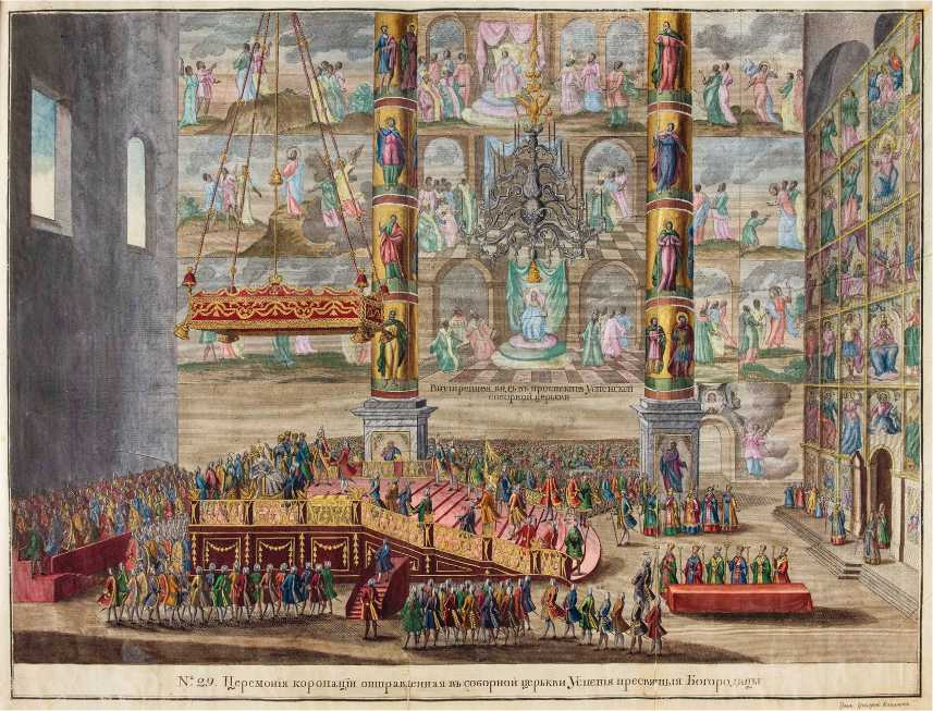 Ил. 2. Г.А. Качалов (по рис. Э. Гриммеля). Церемония коронации императрицы Елизаветы Петровны в Успенском соборе. 1744. Бумага; офорт, резец, акварель. Из книги «Обстоятельное описание торжественных порядков благополучнаго вшествия в… Москву и… коронования… императрицы Елисавет Петровны… 1742 года» (СПб., 1744). БАН