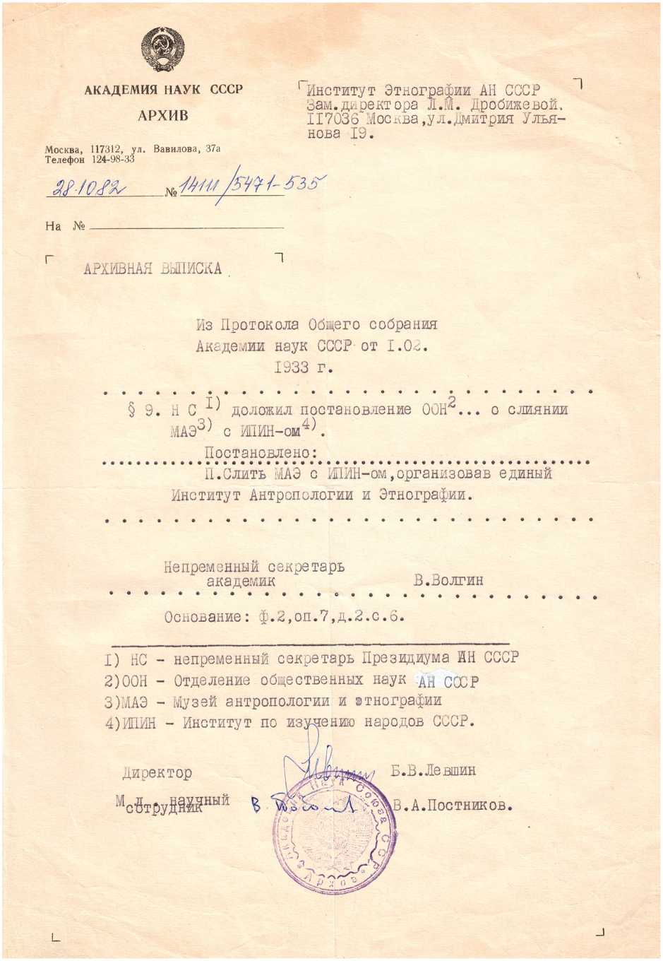 Ил. 11. Архивная выписка из протокола Общего собрания АН СССР о создании Института антропологии и этнографии