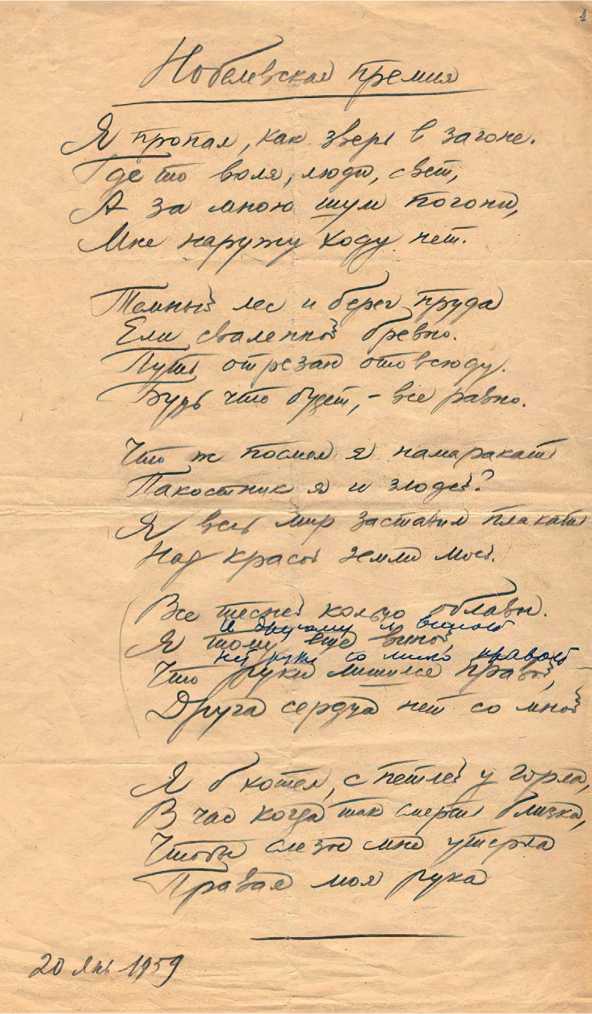 Ил. 7. Автограф стихотворения Б. Пастернака «Нобелевская премия». 20 января 1959. Ист.: https://ruverses.com/autographs/boris-pasternak/nobel-prize/