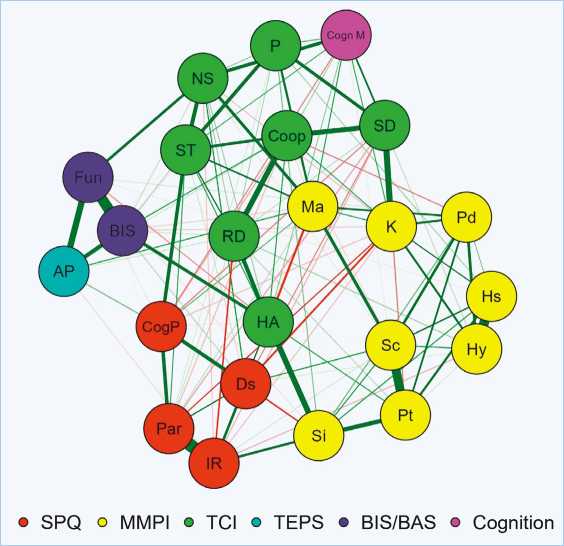 Рис. 1. Сеть психологических признаков. Толщина рёбер отражает силу связи, цвет — направление: зелёный — положительная корреляция, красный — отрицательная. Расшифровка сокращений признаков дана в примечаниях к табл. 1