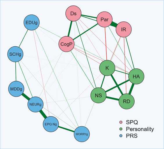 Ни общий балл SPQ, ни отдельные факторы не коррелировали с ПГП риска шизофрении. Кроме того, ПГП риска шизофрении не были связаны со шкалами Шизофрении и Трансцендентности Я. В то же время показатели SPQ коррелировали с ПГП эмоциональной нестабильности. Последние были также связаны с установкой на ответ (K) и некоторыми личностными чертами. Учитывая размер выборки, мы включили в анализ сетей, помимо факторов SPQ, только те личностные черты, которые были наиболее тесно и непосредственно связаны с шизотипией (рис. 1) и коррелирующие с ними ПГП, а также ПГП шизофрении. Результаты сетевого анализа представлены на рис. 3.