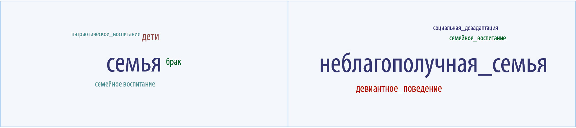 Поскольку в исследованиях российских учёных понятие «жизнеспособность семьи» появилось не так давно, обратимся к анализу тематики исследований психологии семьи в историческом контексте — по названиям статей, отражающим, как правило, актуальность проблематики. Мы провели контент-анализ названий статей по двум временным периодам (1970-е–1980-е и 1990-е–2000-е гг.) и отметили различия в основных понятиях, отражающих научный интерес к теме психологии семьи. Если в статьях 1970-х–1980-х гг. наиболее частотным словом являлась «семья», то в 1990-х–2000-х гг. — «неблагополучная семья»; в 1970-х–1980-х с понятием «семья» близкими по частотности были слова «дети», «брак», «семейное воспитание», «патриотическое воспитание», то в 1990-х–2000-х гг. «неблагополучная семья» как ядерное понятие поддерживалось такими словами, как «девиантное поведение», «социальная дезадаптация» (рис.).