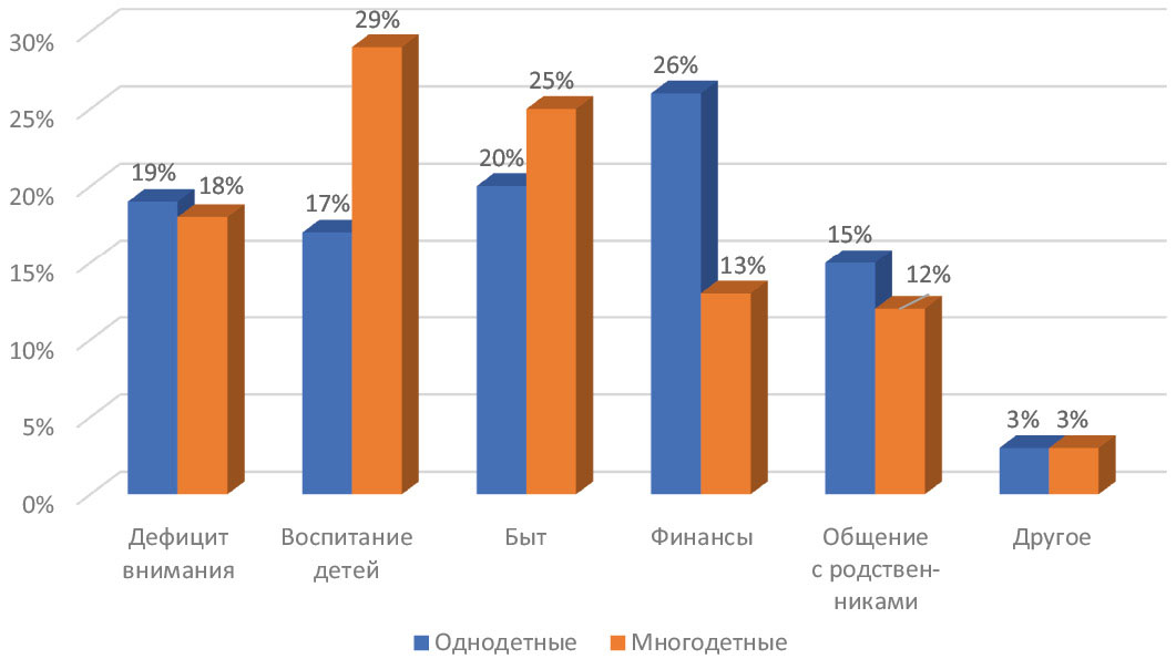 Частота конфликтов по указанным причинам разная в многодетных и однодетных семьях (рис.): в однодетных семьях главными причинами конфликтов становятся финансы, а в многодетных семьях в качестве причин конфликта выделяют воспитание детей и ведение быта (чистота и порядок в доме, качество питания). Дефицит внимания со стороны мужа/жены как причина конфликтов в семьях с разным числом детей находится на третьем месте по частоте встречаемости, а общение с родственниками и другие причины конфликтов наименее частотны.