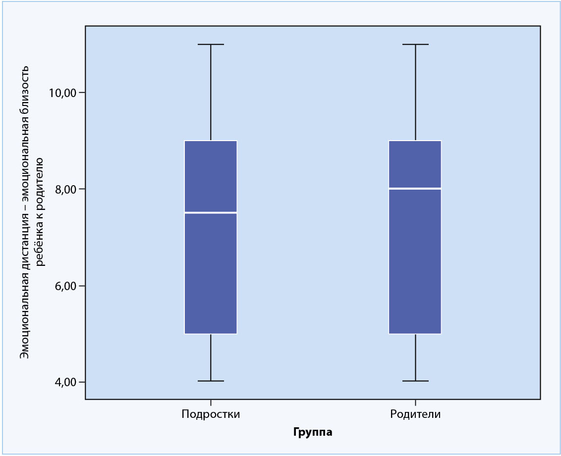 Наиболее важным результатом исследования является установление отсутствия различий между исследуемыми группами по параметру «Эмоциональная дистанция — эмоциональная близость ребёнка к родителю» (F = 12,8; p = 0,761) (рис. 1). В реальности родители и их дети-подростки воспринимают ДРО как эмоционально дистантные, где подросткам практически невозможно делиться самым сокровенным и важным с родителем. Это связано с тем, что родитель не делится сам, что является сигналом для подростка об отсутствии доверительных отношений со взрослым.