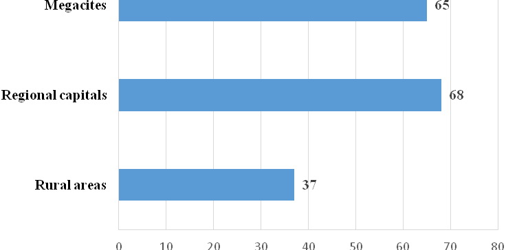Figure 2. Civil identity in settlements of different types (proportion of respondents who answered that they feel a connection with the citizens of the country, as a percentage of respondents)