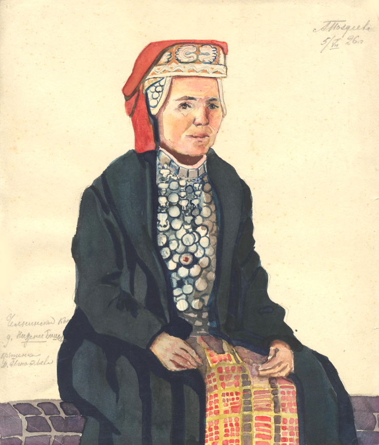 В Челнинском кантоне экспедиция 1926 г. посетила поселения Нижнее Бишево, Верхний, Средний и Новый Багряж, Поповка, Тонгузино (Воробьев, 1927а: 159). Самая ранняя, из выявленных акварелей Л.М. Поздеевой, находится в собрании НМ РТ, под № КППи–117624 от 5 июля 1926. Она атрибутирована как выполненная в д. Нижнее Бишево и с изображением «кряшенки М. Игнатьевой» (Рис. 1). Эту женщину зафиксировала не только Л.М. Поздеева. Ее сфотографировали во время экспедиции, а позже в черно-белом цвете опубликовал Н.И. Воробьев в приложении к статье «Некоторые данные по быту крещеных татар…» (Воробьев, 1927а: вкладка, рис. 6., после с. 172). Исследователь не указал имя изображенной, а лишь подписал: «Кряшенка в праздничном наряде. На голове богатый сурска, на груди тамакса и девет. На шее – яка челбыры». Для Н.И. Воробьева весьма значимыми являлись конкретные элементы костюмного комплекса, в статье он много внимания уделяет особенностям одежды и украшений, в частности, описанию праздничного головного убора замужней кряшенки (Воробьев, 1927а: 164–172).