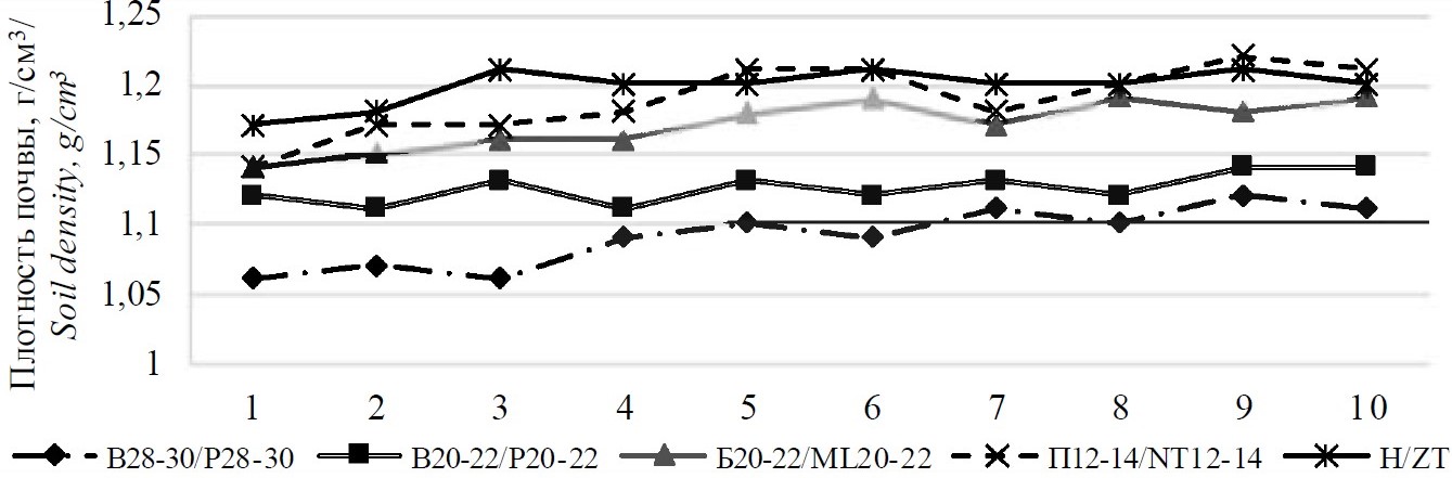 The research was conducted in stationary experiment in the period from 1991 to 2023 on southern black soil of the Orenburg Cis-Urals in the Orenburg State Agrarian University. The purpose of the research was to study the dynamics of soil density during long-term use of soil cultivation methods and systems that differ in the level of minimization. For the present work, from 16 systems studied, the 4 most contrasting in terms of intensity and depth of impact on the soil were selected: 1 – plowing at 20-22 and 28-30 cm (intensive); 2 – non-mouldboard loosening at 20-22 and 28-30 cm (multi-depth, non-mouldboard); 3 – shallow at 12-14 cm, normal at 20-22 cm and deep at 28-30 cm flat-cutting (minimal), 4 – zero alternating with shallow and deep loosening, while for grain crops it was carried out for two years in a row and in total 14 times in 35 years (soil-saving). The moldboard cultivation system ensures the most loose soil composition. With multi-depth, non-moldboard, minimal and soil-saving systems, the volumetric mass of the soil increases by 0.10 g/cm3, 0.11 g/cm3 and 0.12 g/cm3, respectively, at the beginning of research and by 0.08 g/cm3, 0.10 g /cm3 and 0.09 g/cm3 at the end. Reducing the depth of tillage, regardless of the method, contributes to the formation of a “plow sole” in the layer lying below the horizon loosened by the working part of the tool: with conventional plowing and moldless loosening in a layer of 20-22 cm, with shallow tillage - 10-20 cm. With all methods and soil cultivation systems, the soil density remains in the zone of optimal values, with the exception of the option with shallow tillage, where in a layer of 10-20 cm it goes beyond the upper limit of the optimum.