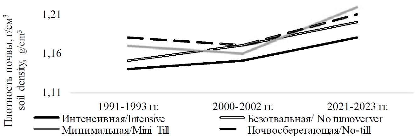 Имеются работы, оценивающие влияние систем обработки на динамику плотности почвы в результате длительного их применения. В исследованиях Пакуль А.Л. с соавторами (2019) комбинированная глубокая, комбинированная минимальная и нулевая системы обработки почвы привели к незначительному увеличению плотности почвы, по сравнению с отвальной, но связано это не с длительным применением систем, а влиянием приёмов обработки почвы. К аналогичному выводу приходят многие авторы (Blanco-Canqui H et al., 2022). В других опытах (Поляков Д.Г., 2021; Topa D et al., 2021) при длительном применении прямого посева происходило разуплотнение почвы. Однако в опыте Перфильева Н.В. и Вьюшина О.А. (2023) с традиционной, консервирующей и нулевой системами обработки почвы плотность была практически одинаковой. И наоборот, в опытах Семенцова А.В. с коллегами (2016) при длительном применении различных систем обработки почвы на 9-й год произошло увеличение плотности пахотного слоя почвы, но в большей степени на безотвальной и мелкой системах.
