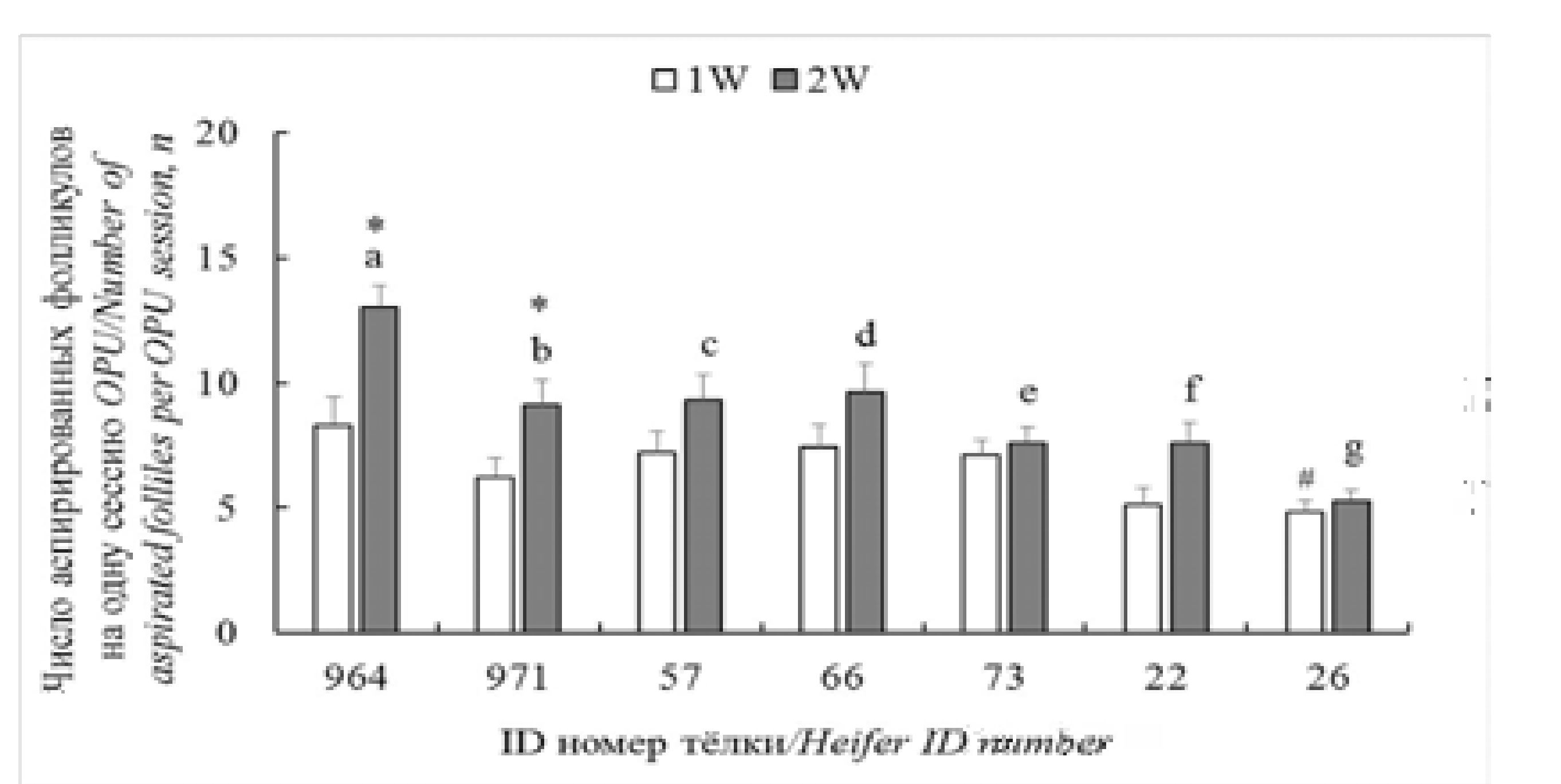 Результаты трансвагинальной аспирации фолликулов у отдельных доноров представлены на рисунке 1. Выявлена зависимость количества аспирированных фолликулов как от индивидуальных особенностей опытных животных, так и от временных параметров проведения OPU. В случае выполнения этой процедуры в режиме 2 раза в неделю (2W) у тёлки с идентификационным номером 964 среднее количество аспирированных фолликулов на 1 сессию OPU имело наибольшее значение (13,0±0,9 фолликулов) и было выше (от Р≤0,05 до Р≤0,001), чем у других 7 доноров. Минимальное количество фолликулов (5,3±0,4) пунктировано у тёлки № 26, которое было ниже не только по сравнению с тёлкой № 964 (Р≤0,001), но и в сравнении с некоторыми другими донорами (Р≤0,05). Когда OPU проводилось раз в неделю (1W) по данному показателю различия между отдельными животными были менее выражены, его максимальное (8,3±1,2 фолликула) и минимальное (4,8±0,5 фолликула) значение сохранялось за теми же телками (№ 964 и 26 соответственно) что и при 2W, и только между ними установлены достоверные отличия (Р≤0,05). У двух (№ 964 и 971) из 7 доноров при режиме 2W показатель количества аспирированных фолликулов на одну сессию OPU был существенно выше, чем при режиме 1W (Р≤0,05).