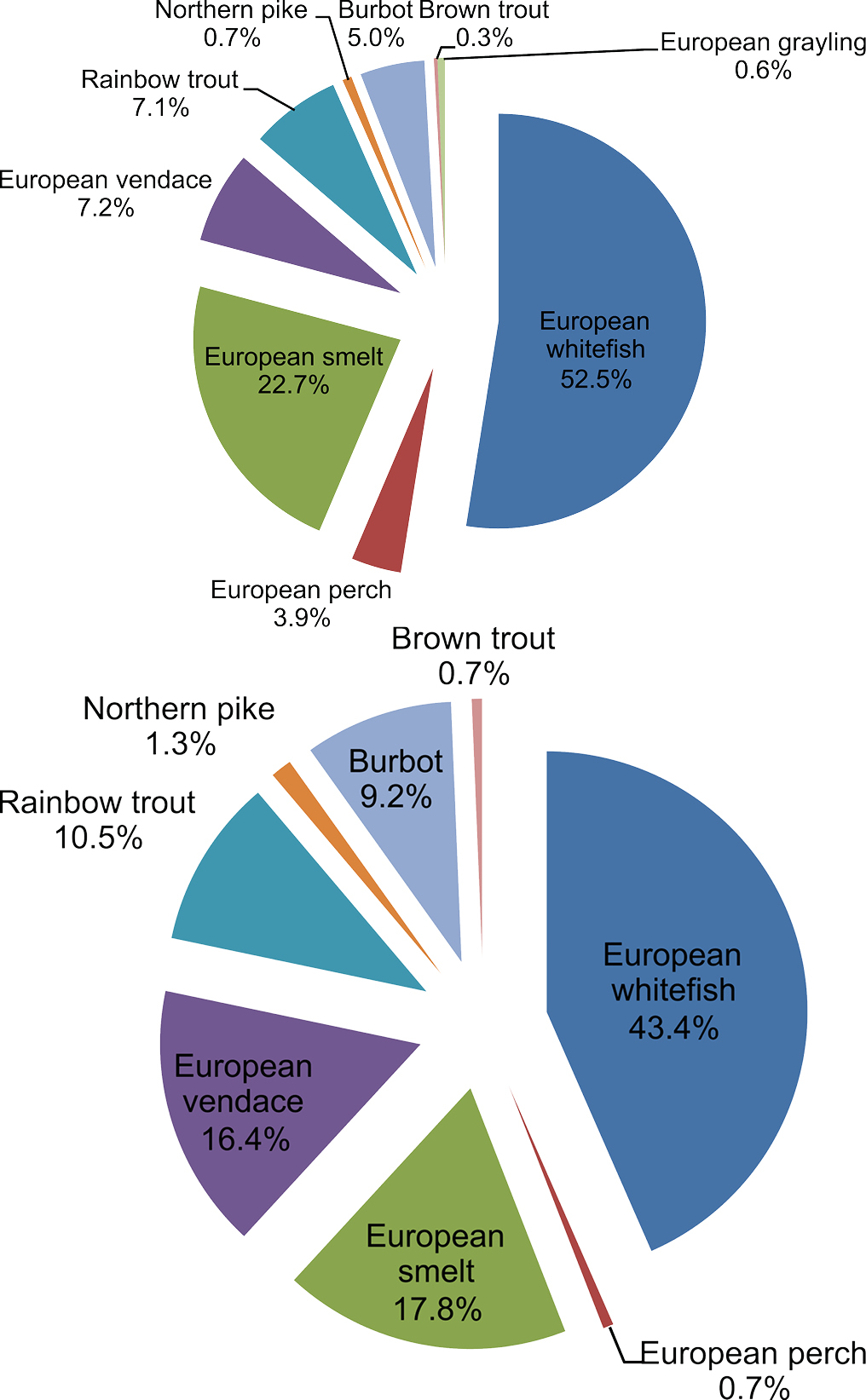 During our work from 2018 to 2022, ten species of fish were identified as part of the NTR ichthyofauna: rainbow trout, brown trout Salmo trutta Linnaeus, whitefish, European vendace Coregonus albula (Linnaeus), European smelt, European grayling Thymallus thymallus (Linnaeus), European perch Perca fluviatilis Linnaeus, burbot Lota lota (Linnaeus), and northern pike Esox lucius Linnaeus. The nine-spined stickleback Pungitius pungitius Linnaeus was observed in the stomachs of burbot and rainbow trout, as well as in the coastal zone of the reservoir. The dominant NTR species include whitefish, whose share in catches varies from 43 to 53% depending on the season (Fig. 2a, b). Thus, in the summer-autumn period, the number of whitefish in the sample reached more than 80%. In the summer-autumn period, 52% of whitefish were caught in the profundal zone of the reservoir and 48% in the littoral zone.