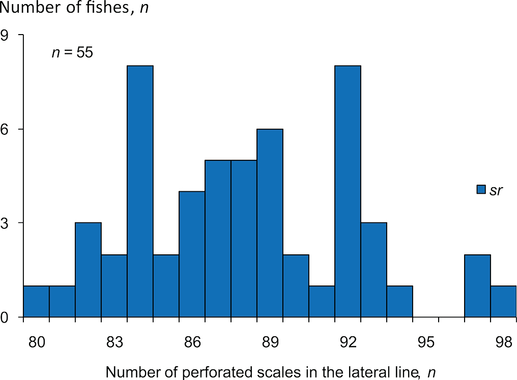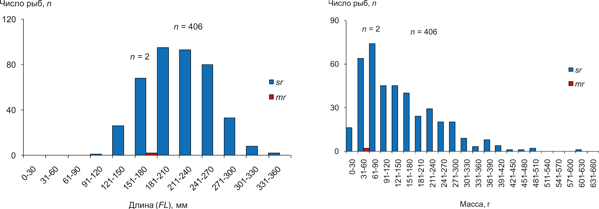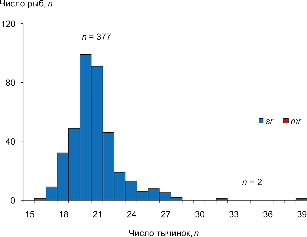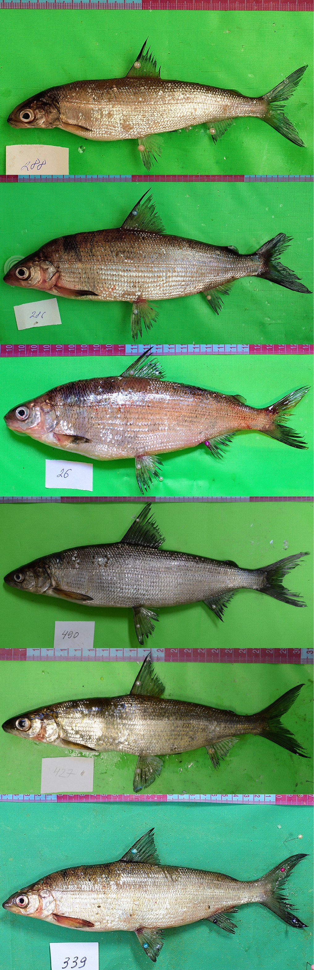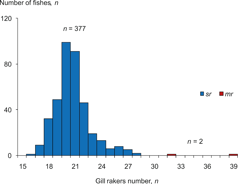 The catches from the NTR mainly contained the sparsely rakered (hereinafter sr) whitefish morph with the number of sp.br. from 16 to 28 (20.7 ± 0.10) (Fig. 3).Throughout the entire study period, only two whitefish individuals were caught with the number of sp.br. 32 and 39, which can be classified as the medium rakered (mr) whitefish morph (Fig. 3).Visual analysis of the external structure of whitefish from the NTR during catching and processing of the material, as well as the study of the resulting images of fish samples, revealed some differences in the morphology of the head and body of individual specimens of the sr whitefish morph. Thus, the NTR met: