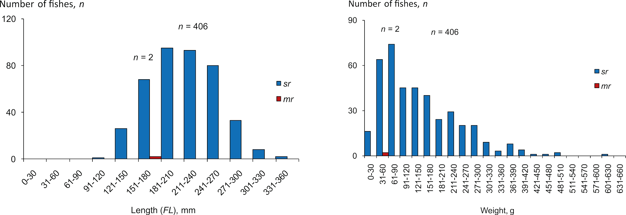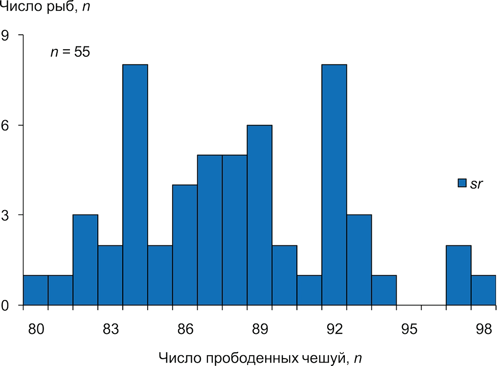 Fig.3. The European whitefish distribution by the number of gill rakers on the first branchial arch, n in the Nizhnetulomskoye Reservoir (Tuloma River basin), 2018-2022. Sr – sparsely rakered whitefish morph, mr – medium rakered whitefish morph