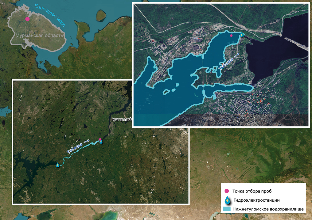 The Tuloma River basin is located in the north-west of the Murmansk region (Fig. 1). Before damming, the Tuloma River originated from Notozero Lake (since 1962 is a part of the VTR with an area of 745 km2). The river flows into the Kola Bay of the Barents Sea (Fig. 1). After the Tuloma River regulation by the dams of hydropower stations (hereinafter HPP) Nizhnetulomskaya and Verkhnetulomskaya, the majority of the river is the NTR (Fig. 1). The length of the Tuloma River is 59.8 km, and the catchment area is 18231.5 km2 (Catalogue..., 1962). The catchment area of the river is represented by complex and extensive lake-river systems draining the territory of the western part of the Murmansk region, where there are numerous hills and tundra. The Salnye Tundry are located in the watershed between the Barents and White Seas. The flow of the main tributaries of the Tuloma River, the Nota and Lotta rivers,which originate in Finland, is formed on the slopes of the hills and adjacent swampy plains. There are more than 5 thousand lakes in the Tuloma River catchment area. The river fall is 48 m, the average slope is 0.3%. In the mountainous section, the river is located in a narrow and deep gorge (incision depth is 200-300 m) and forms incised bends. There are many rapids on the river. In the lower reaches of the river (below the village of Murmashi), the influence of sea tides are felt. There are two HPP on the Tuloma River: Verkhnetulomskaya (since 1965) and Nizhnetulomskaya (since 1937), forming the VTR and NTR, respectively (Catalogue..., 1962; Surface..., 1969).