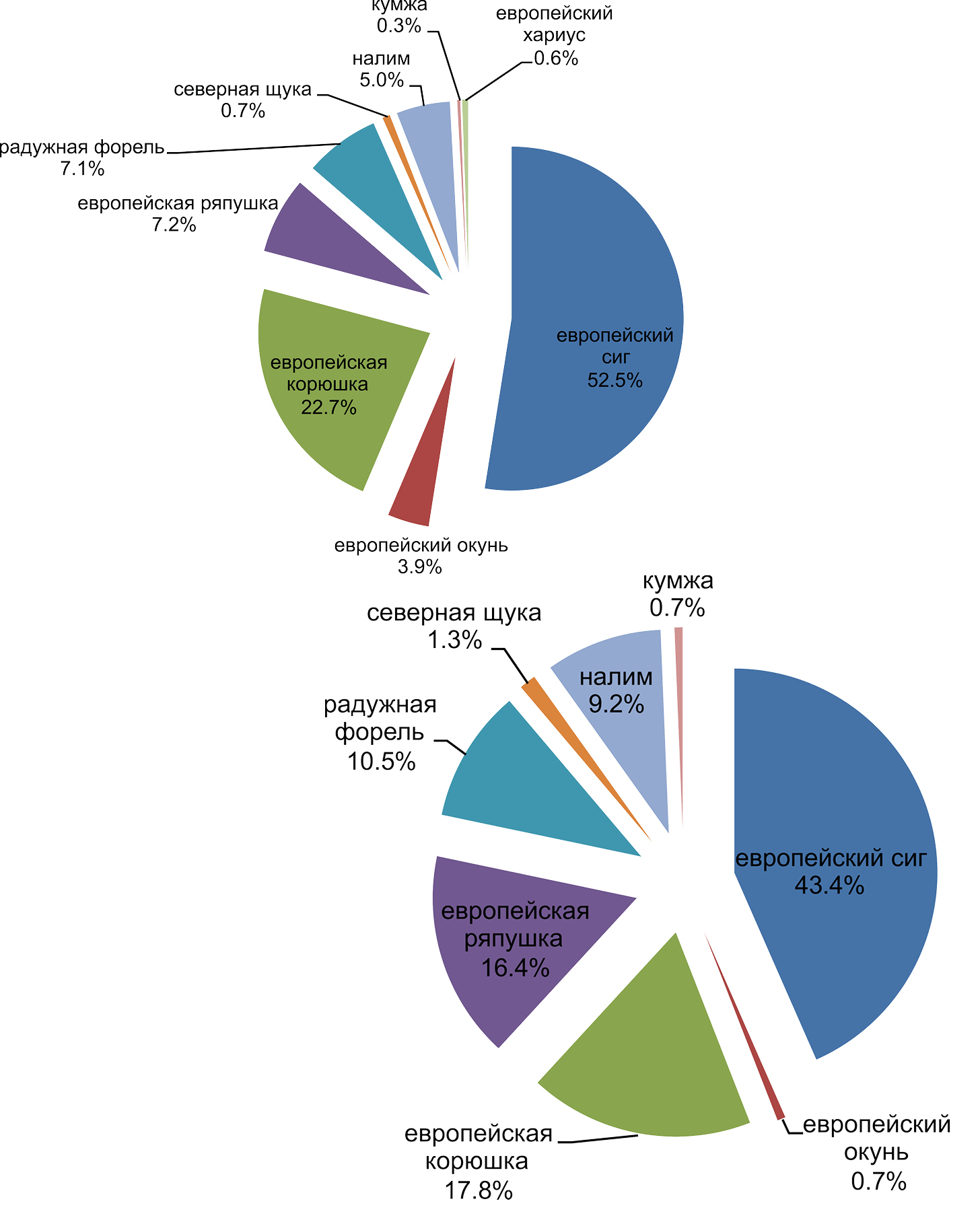 The abundance of European smelt (hereinafter smelt) in general during the entire study period reached 18-23% (subdominant species) (Fig. 2a, b). Less numerous in the catches were European vendace (vendace) and rainbow trout, which periodically escape from their rearing cages. The share of such fish ranges from 7 to 16% (Fig. 2a, b). European perch (perch) and burbot are less common. The number of perch reached almost 4% during the period of open water (Fig. 2a), while for burbot, a naturally higher occurrence in catches (9%) is typical for the winter period (Fig. 2b). Other fish species were encountered only sporadically.