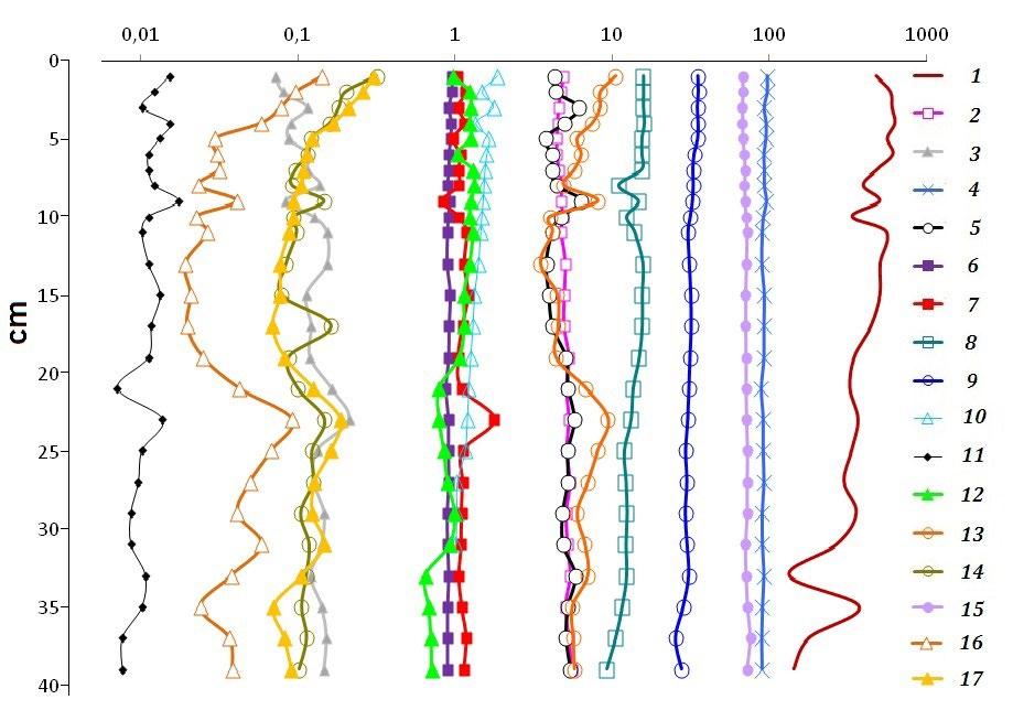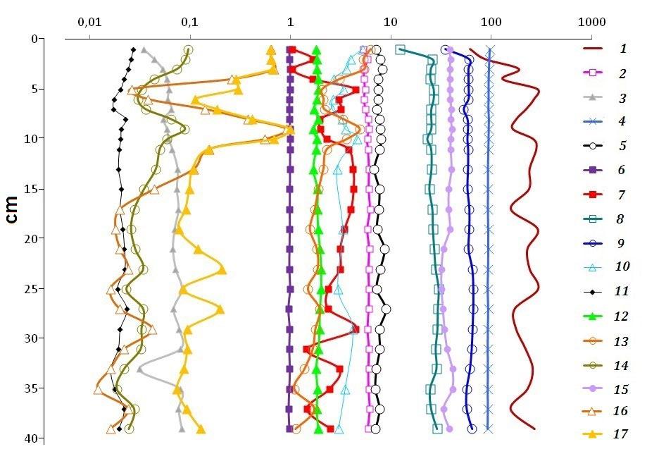 4. Fig.3. – Vertical distribution of chemical, physical and physico-chemical characteristics in the surface layer of bottom sediments of Lake Vendyurskoye. 1– Eh, mV; 2 – pH; 3 – solid matter mass in 1 ml of wet soil, g/ml; 4 – Wet20°С, %; 5 – Wet105°С, %; 6 – por; 7 – ds, g/cm3; 8 – Сorg, %; 9 – LI550°С, %; 10 – OD1, mgO2/g; 11 – NNH4+, %; 12 – Norg, %; 13 – Fe, %; 14 – Mn, %; 15 – Ash, %; 16 – Pmin, %; 17 – Ptot.