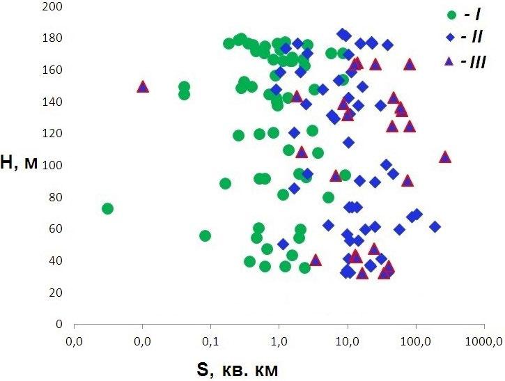 2. Fig.1. Distribution of lakes with different types of sediments: green is organomineral (ash content<80%), blue is mineral (ash content >80%); I is iron-silicon-humus, II is iron-humus-silicon, III is humus-iron-silicon) depending on the location (H is altitude above sea level, m) and size (S is lake mirror area, km2)