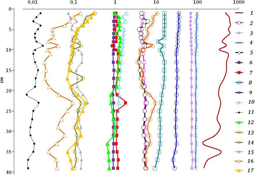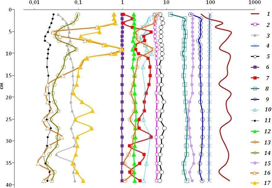 Fig.3. – Vertical distribution of chemical, physical and physico-chemical characteristics in the surface layer of bottom sediments of Lake Vendyurskoye. 1– Eh, mV; 2 – pH; 3 – solid matter mass in 1 ml of wet soil, g/ml; 4 – Wet20°С, %; 5 – Wet105°С, %; 6 – por; 7 – ds, g/cm3; 8 – Сorg, %; 9 – LI550°С, %; 10 – OD1, mgO2/g; 11 – NNH4+, %; 12 – Norg, %; 13 – Fe, %; 14 – Mn, %; 15 – Ash, %; 16 – Pmin, %; 17 – Ptot.