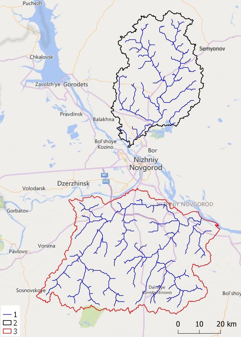 The Cheboksary reservoir is formed on the Volga River by the Cheboksary hydroelectric plant, located in the city of Novocheboksarsk. The length of the reservoir is 341 km, the area is 2190 km2, the total volume of water is 13.9 km3, the area of its own catchment basin without the upstream Volga basin is 131.9 thousand km2. The Linda (left tributary of the Volga, its length is 122 km, its catchment area is 1682 km2) and the Kudma (right tributary of the Volga, its length is 144 km, its catchment area is 3248 km2) catchments in the basin of the Cheboksary reservoir were selected as pilot sites reflecting the main patterns of biogenic element removal on the basis of expert assessment (Fig.1). The catchment basins are representative of the forested left bank and the agriculturally developed right bank of the Cheboksary reservoir. Moreover, karstic phenomena are widespread in the Kudma basin, which also influence the formation of runoff and the removal of nitrogen and phosphorus. There are gauging sections of state hydrological and hydrochemical monitoring of the Russian meteorological service in the selected rivers, which enables using these data for the calibration of mathematical models.