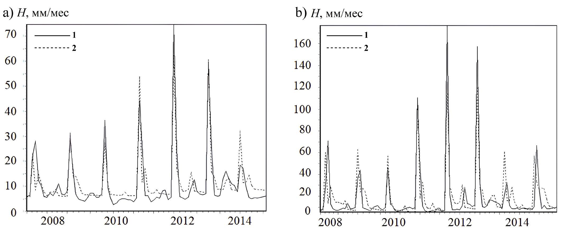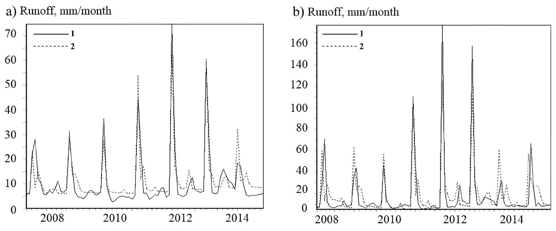 3. Fig.2. The observed (1) and calculated (2) average monthly runoff layers from the Kudma (a) and Linda (b) catchments.