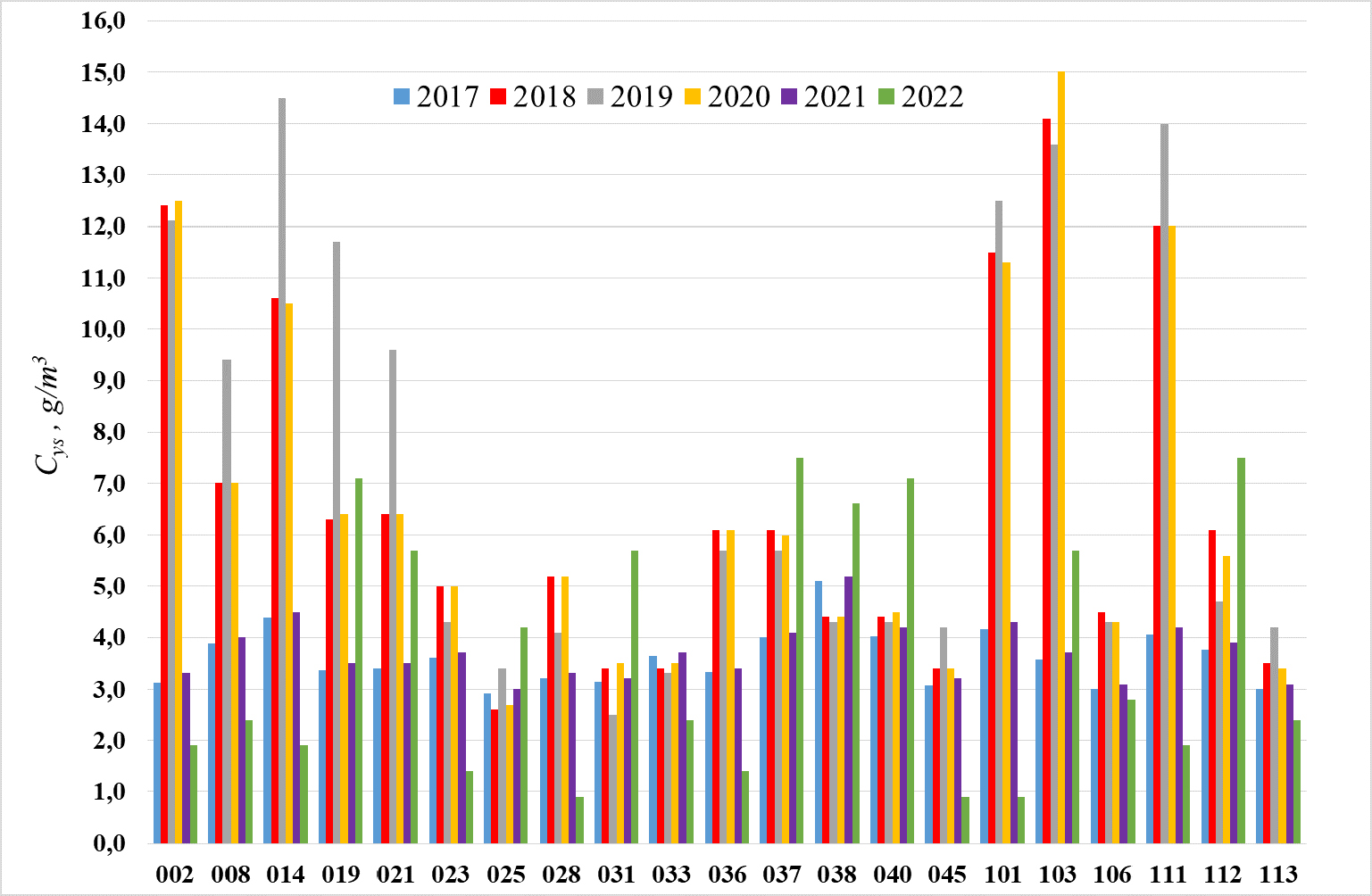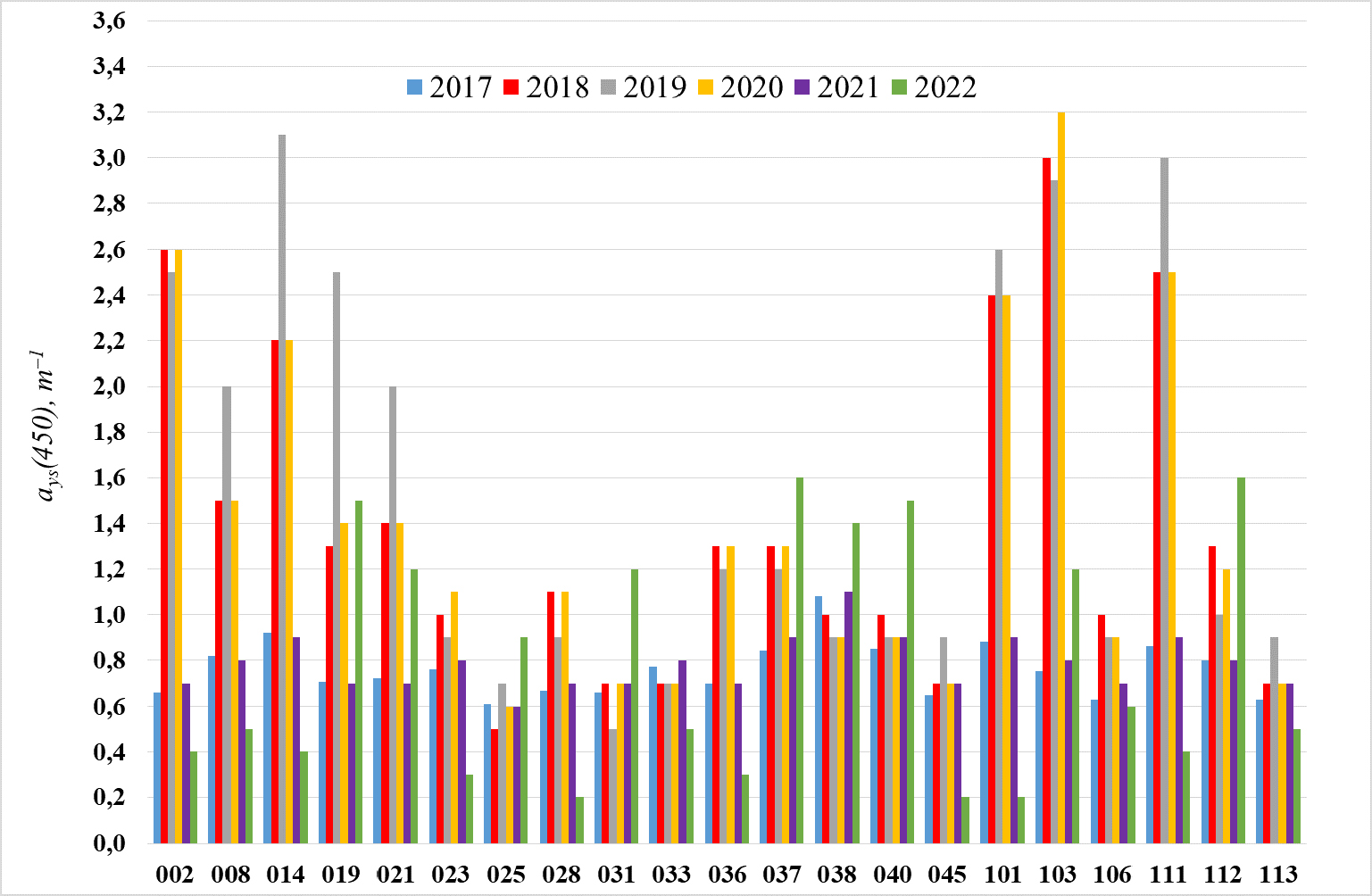 Over a 6-year period of optical investigations, indicators of light absorption by yellow substance ays(λ) at wavelengths λ= 430, 450, 550 and 670 nm in the surface layer showed minor fluctuations (0.1‒3.2 m‒1) Maximum values (above 2.0 m‒1) were recorded in 2018–2020 on rivers Chulyshman, Chulyush and Kyga, including Cape Syraktu. As an example, Fig. 2 and 3 represent the dynamics of с(430) and ays(450), respectively.