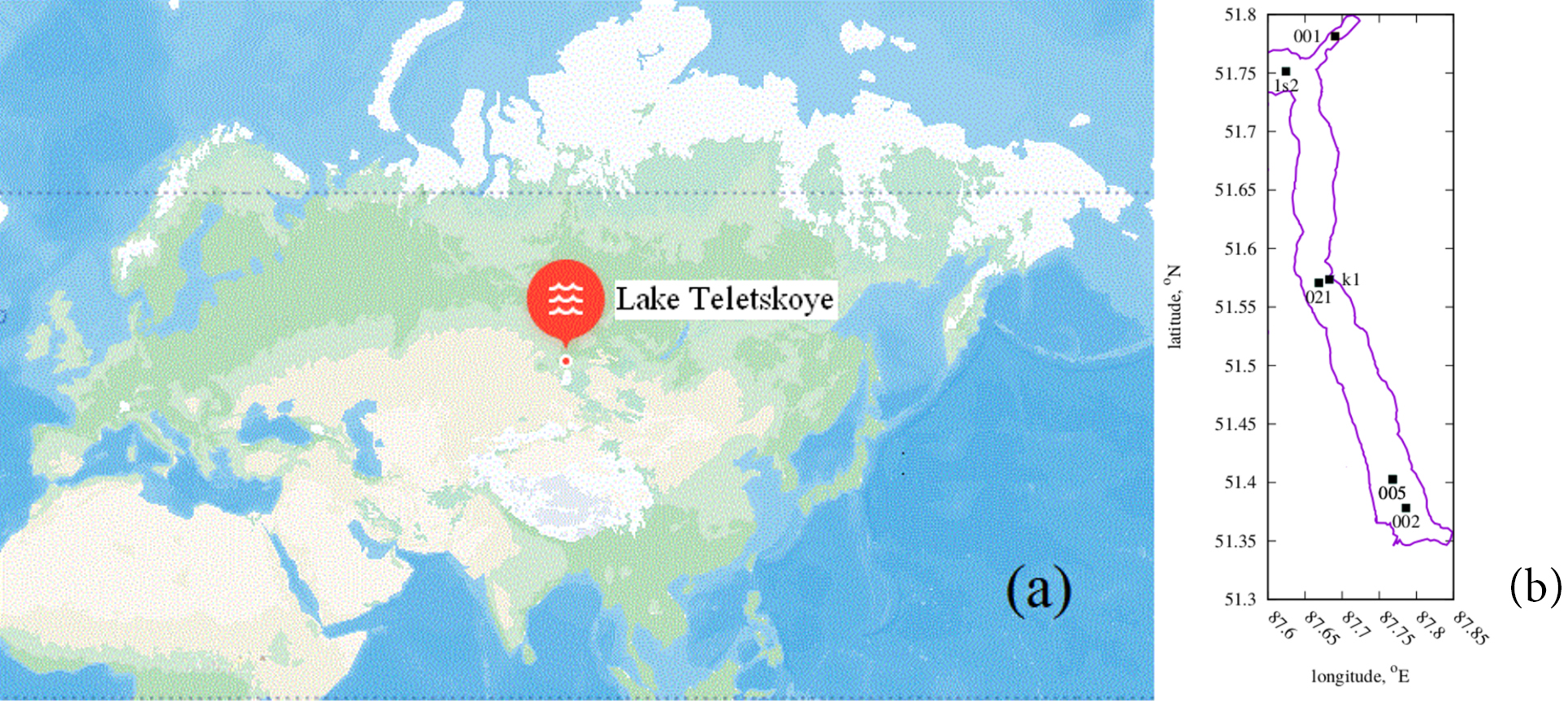 Fig.1. Geographical location of (a) Lake Teletskoye and (b) stations at which measurements of the spectral irradiance profile were carried out in August 2023.