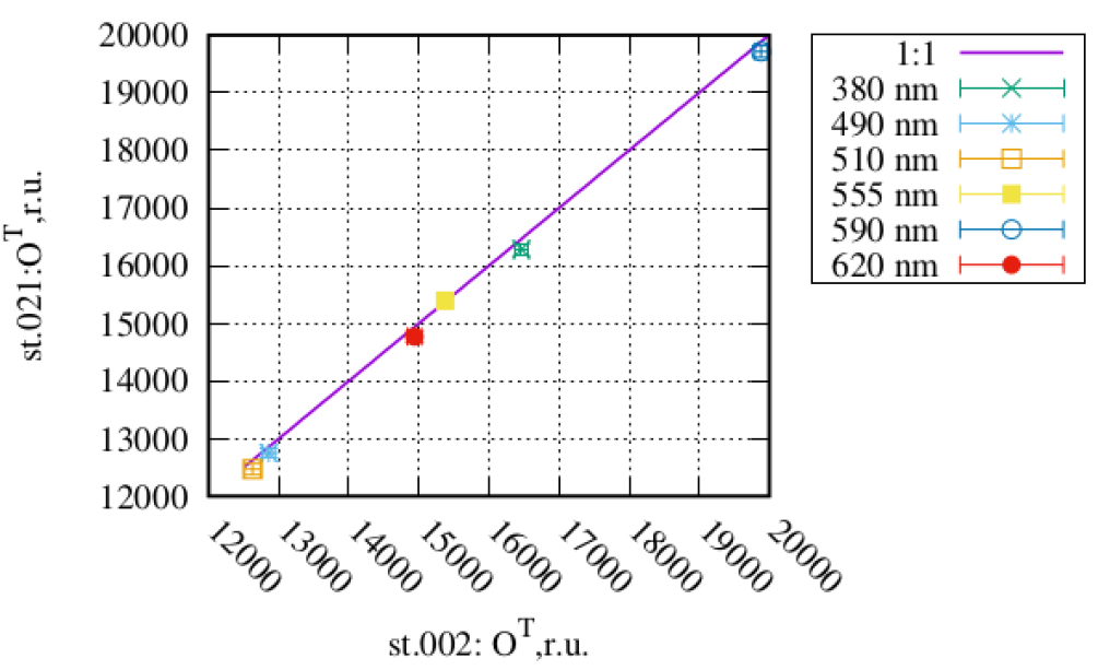 To test the hypothesis of the stability of the “dark” telemetric signal of horizontal irradiance for seven bands, measurements were used at the station 002 and 021. The time difference between measurements at these stations was 2 days. The results are presented in Fig. 4 and Table 1. Table 1 shows the average value of , their standard deviation (SD) and the number of measurements N. From Fig. 4 it is clear that the calibrations are stable.