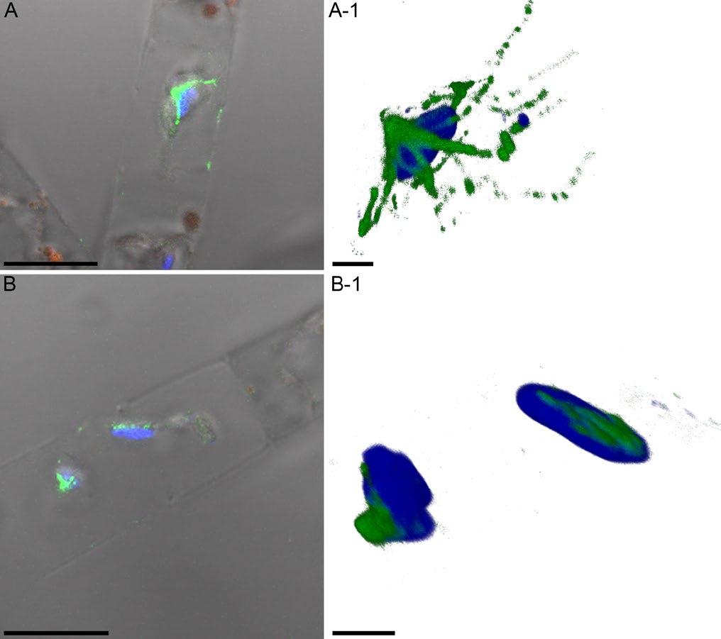 Fig.2. Visualization of α-tubulin at the early stage of valve formation and in interphase in one optical section (A, B) and 3D-reconstructions (A-1, B-1) in the cells of A. islandica (LSM). Green – fluorescence of Alexa-488 after staining of α-tubulin, blue – fluorescence of DAPI, red – autofluorescence of chlorophyll. Scale bar: A, B – 10 µm; A-1, B-1 – 2 µm.