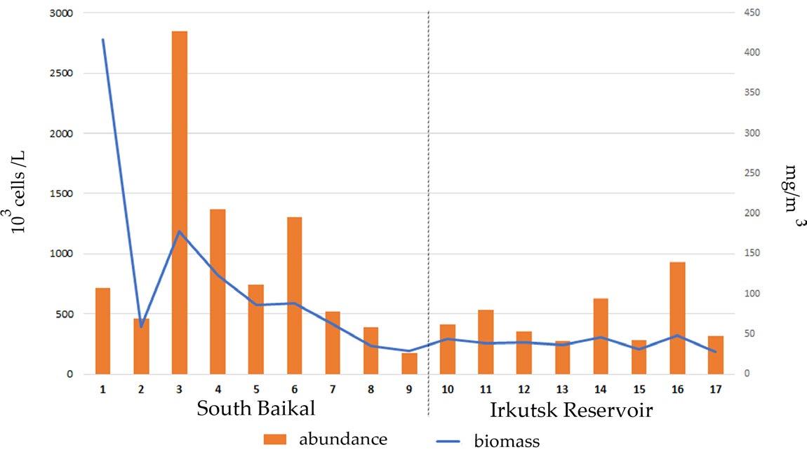 The total abundance and biomass of phytoplankton in South Baikal varied significantly from 190×103 to 2779×103 cells/L and 26 to 427 mg/m3, respectively (Fig. 2). The highest abundance was recorded at St. 1 (12 km from Kultuk) due to a bloom of three small-cell species such as Cyanodictyon planctonicum, Cyanodictyon sp. и Microcystis sp., therefore, the total biomass did not exceed 107×103 cells/L despite the highest abundance. At St. 3, the highest biomass was determined by Dinobryon species. The total abundance and biomass of phytoplankton in Irkutsk Reservoir were lower than in South Baikal, 186×103 to 310×103 cells/L and 41 to 140 mg/m3, respectively (Fig. 3).