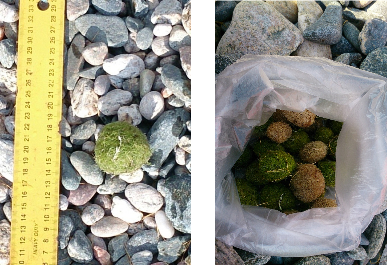 Fig.1. Photographs of algal balls in situ washed ashore and collected in Ludar Bay on the west coast in the northern basin of Lake Baikal, September 2014.
