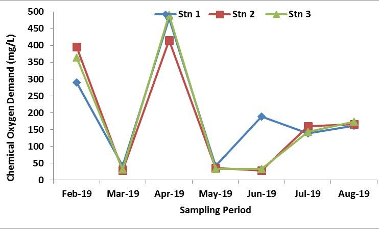 Chemical oxygen demand values recorded were higher compared to 2.0-7.0 mg/L recorded in Aba River, Aba by Amah-Jerry et al. (2017) and 14.95-31.47 mg/L recorded in Saba River, Osogbo, Nigeria by Yusuf et al. (2017) but lower than 425.0-1675 mg/L recorded in Illo River, Ota, Nigeria by Omole and Longe (2008) and 444.0-1508 mg/L recorded in a stream in Gboko, Nigeria by Ubwa et al. (2013). The highest COD values were recorded in April 2019 and declined afterwards; a trend observed by Yusuf et al. (2017). The COD values indicated that the Akor River was mildly polluted. The values of COD recorded in surface waters usually range from 20 mg/L or less in unpolluted waters to greater than 200 mg/L in effluent-receiving waterbodies (Chapman and Kimstach, 1996).