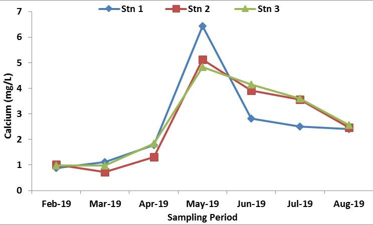 In this study, Mg2+ values recorded were low and within acceptable limits set by FMEnv (2011). Some recent studies carried out in Southeast Nigerian fresh waters also recorded low Mg2+ values. Anyanwu and Ukaegbu (2019) equally recorded values between 0.42 and 1.38 mg/L in the Ossah River, Umuahia. There is a seasonal variation with respect to Mg2+ values in the river; higher values were observed during the rainy season than in the dry season. This may be attributed to multiple factors such as physical weathering and farming activities coupled with early and heavy rains that could wash the weathered Mg2+-contained materials into the Akor River.