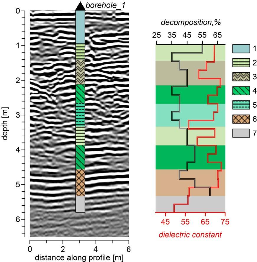 Fig. Comparison GPR and borehole data: 1 – water-saturated peat, 2 – buckbean-sedge peat, 3 – sphagnum peat, 4 – hypnum peat, 5 – sedge peat, 6 – organic gyttja, 7 – clay.