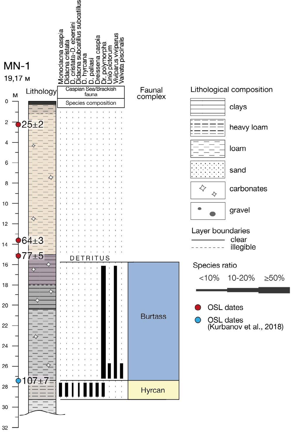 The sediments of the borehole were studied by the malacofaunistic method in order to provide a biostratigraphic substantiation of the highlighted sediments. Geochronological data were obtained using the OSL dating method.