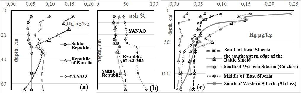 Fig.1. Vertical distribution of the contents of Hg (µg/kg) and ash (%) in bottom sediment cores from taiga lakes of various research areas: (a) the contents of Hg (µg/kg), (b) ash (%) for lakes located along 63° n. latitude; (c) the contents of Hg (µg/kg) for taiga lakes of various research areas