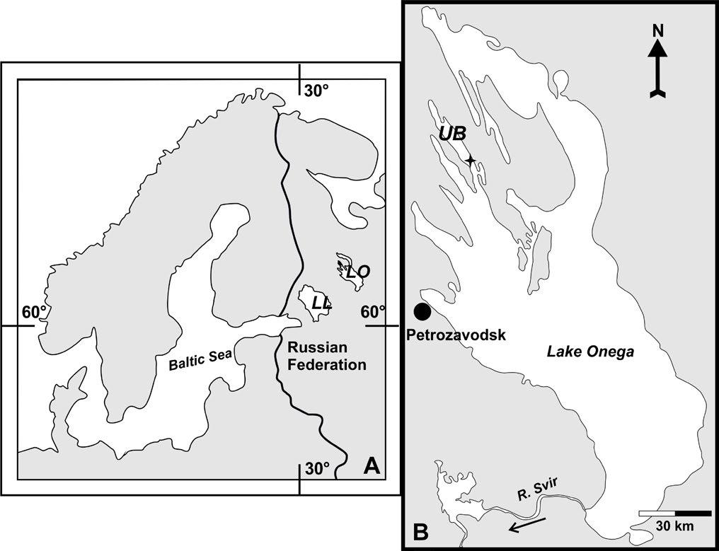 Fig.1. Location map of: A) Lake Onega (= LO; LL = Lake Ladoga), B) the study site (UB = Unitskaya Bay, star indicates the coring site)