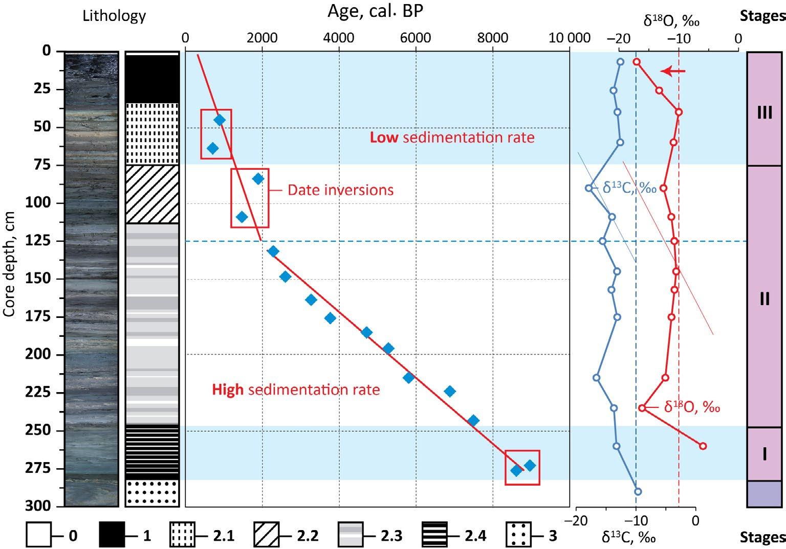 The age of the lake sediments is determined by 15 radiocarbon dates (Fig. 1). We investigated the mineralogy and geochemistry of the lake sediments and the composition of their pore waters. The concentrations of anions in the pore water were determined by titrimetry (HCO3–) and capillary zone electrophoresis. The total dissolved organic carbon (DOC) in pore water was determined on an Analytik Jena AG Multi N/C 2100S analyzer. The contents of chemical elements in bottom sediments and pore water were determined by ICP-AES. The mineral composition of the sediments was studied by XRD, using a DRON-4 diffractometer with CuKα radiation. The total organic carbon (TOC) in bottom sediments was evaluated by Tyurin’s method. The grain size of the sediment was measured on Analysette 22 MicroTec.