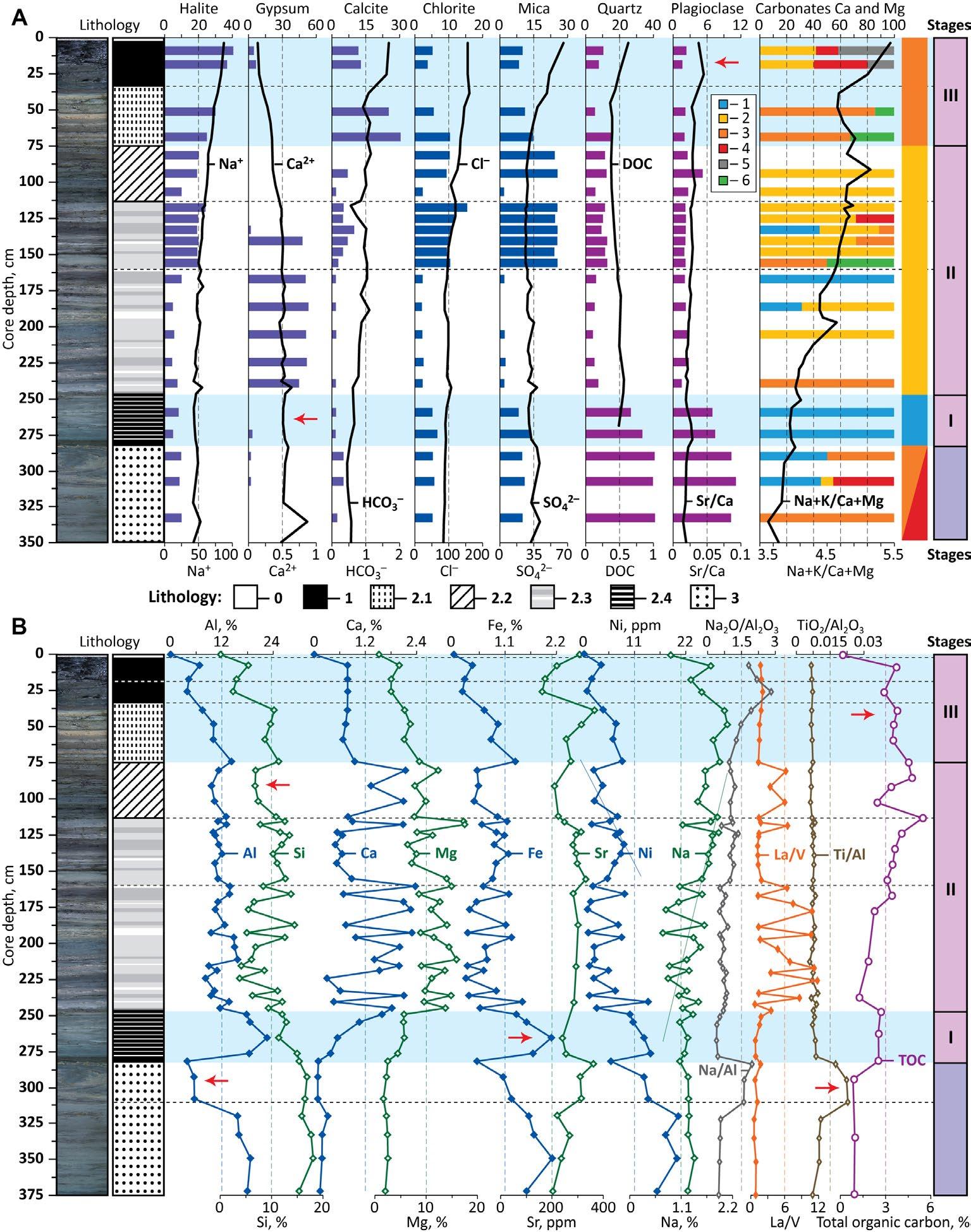 Stage II (5.8–2.3 cal ka BP). Transportation of terrigenous minerals was low in the first half of the stage and considerably increased in the second. By authigenic minerals, it was a gypsum stage with sharp increase in proportion of halite in the second half. The succession of precipitation of minerals infers the bottom-to-top increase of alkalinity and salinity of the lake. The concentrations of Na+, Cl–, SO42– increase, and Ca2+ decrease in the pore waters, which confirms the trend to salinization. The low Ca and Mg carbonate content in the interval of 230–160 cm can be an indicator of a higher level of water in the lake. This is indicated by the drop of halite and terrigenous minerals—mica, quartz, and chlorite. In the subsequent part of Stage II, interval 160–110 cm, the lake geochemistry abruptly changed: gypsum sharply decreased and halite and calcite became the dominated authigenic minerals. At the same time, the portions of mica, quartz, and chlorite also increased. The higher Ca and Mg and decreased Al, Fe, and Si, also confirm a sharp change of the lake geochemistry: salinization and high terrestrial input.