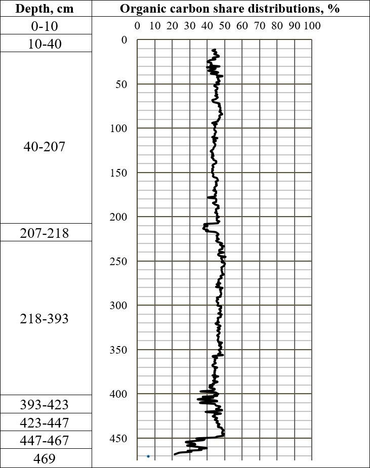The average content of organic carbon is 43.65%. The minimum value is 5.95% (469-470 cm), the maximum is 50.39% (244-245 cm). Areas of increase and decrease in the percentage of organic carbon correlate with areas of increase and decrease in the percentage of organic matter throughout almost the entire depth of the column.