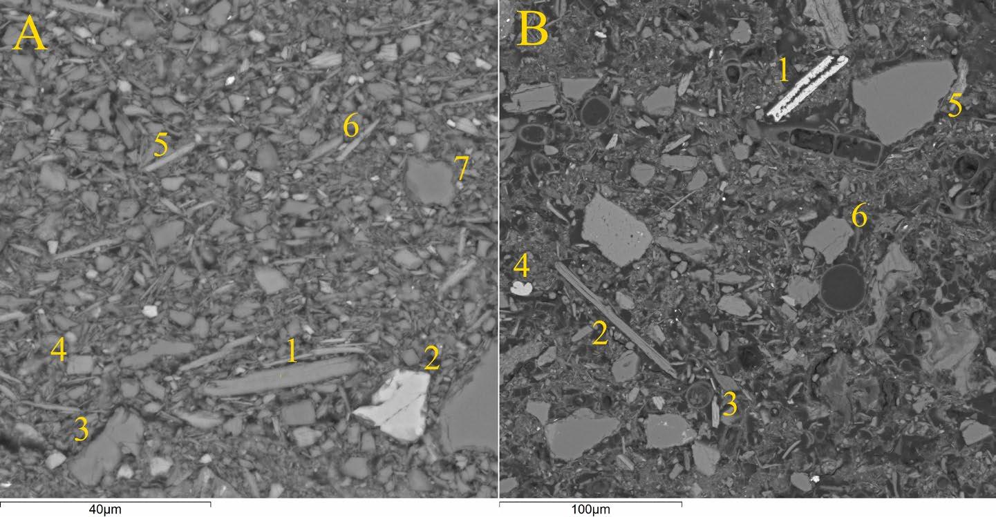 Fig. Terrigenous component of the bottom sediments of (A) Zaonezhsky Bay (northern part of the lake): 1-muscovite, 2 – titanite, 3 – oligoclase, 4 – potassium feldspar, 5 – chloritoid, 6 – chlorite, 7 – quartz; (B) South Onego (southern part of the lake): 1 – ilmenite, 2 – muscovite, 3 – pyroxene, 4 – rutile, 5 – quartz, 6 - potassium feldspar.