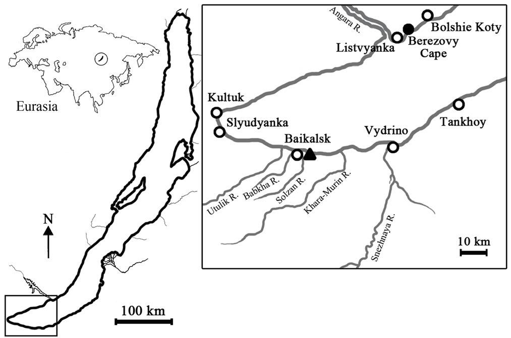 Fig.1. Schematic map of Lake Baikal (on the left) and the map of its Southern basin (on the right). Hollow circles mark large settlements. A black circle marks the location of reference site for the FTIR analyses of interstitial water. A black triangle marks the location of the BPPM.