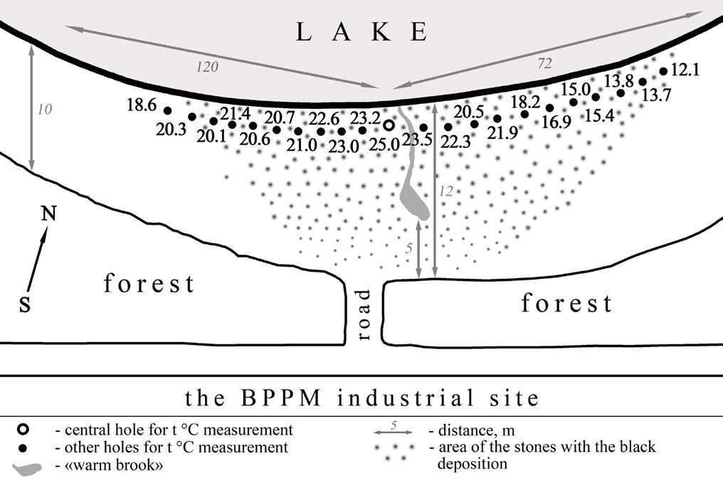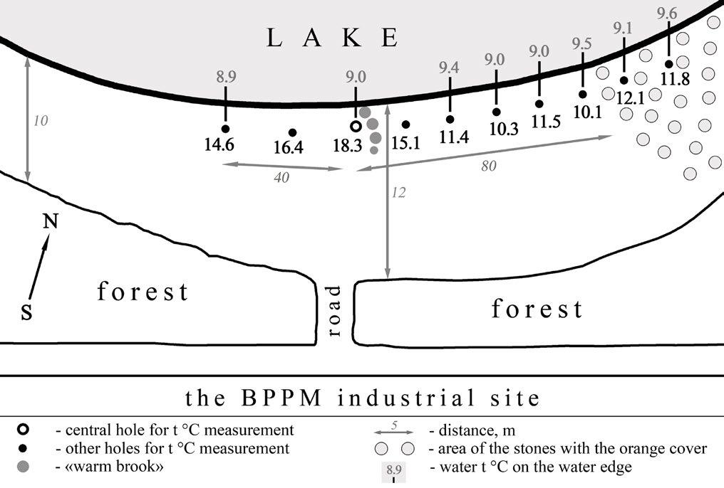 During routine sampling on the beach and in shallow parts, the limnologists registered a few phenomena unusual for the lake’s pristine coastal areas. A thermal anomaly was one of the atypical cases observed. We registered a temperature of 25 °C in a hole dug above the water’s edge on the shore. The temperature measurement with 5 m intervals in both directions from the central hole showed a downward gradient (Fig. 4). The interstitial water temperature gradually decreased from 25 °C to 18.6 °C westward and up to 12.1 °C eastward. Concurrently, the lake water temperature did not rise above 6.5–7.5 °C at the water’s edge.