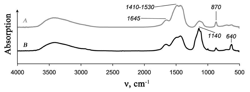 Fig.7. FTIR spectroscopy measurements of solid residues after evaporation of interstitial water. (A) The beach of the Berezovy Cape (reference site). (B) The beach next to the BPPM site.