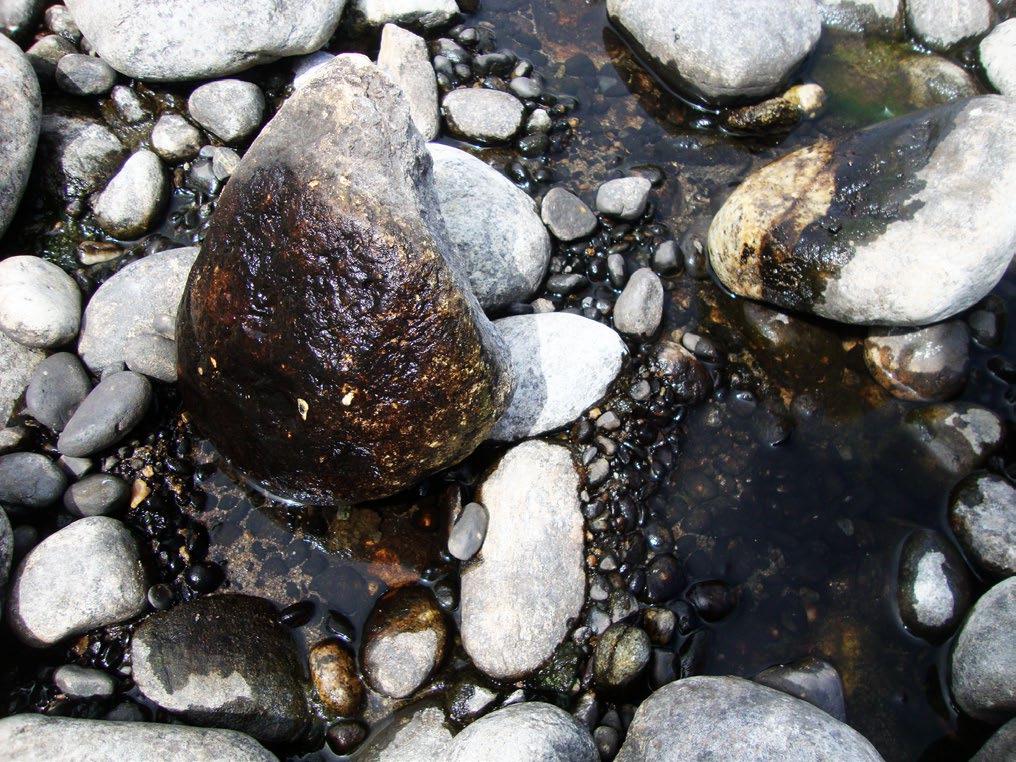 Fig.8. Boulders and pebbles with abnormal black depositions. The beach next to the BPPM site (May 31, 2013).