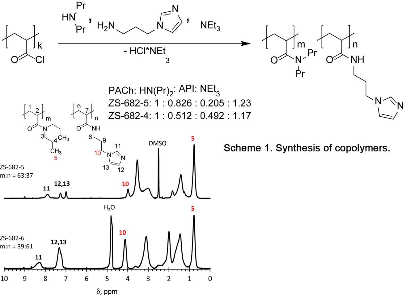 The copolymers were obtained by reacting poly(acryloyl chloride) with 1-(3-aminoprolyl)imidazole (API) and dipropylamine in the presence of triethylamine (Scheme 1)., similar to (Danilovtseva et al., 2017). Structure of the copolymers was confirmed by 1H NMR (Fig. 1) and their composition was analyzed by signal intensity ratio at 0.5-1.1 ppm (CH3 groups) and 3.9-4.4 ppm (CH2 group attached to the imidazole cycle).