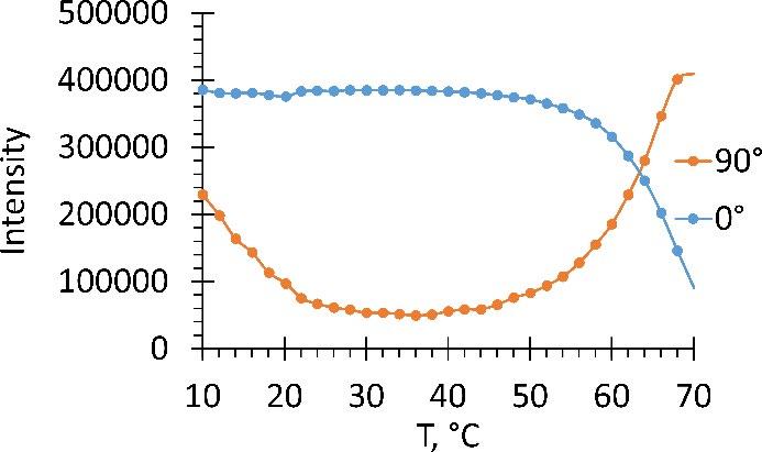 The ZS-682-6 copolymer precipitates out of water at pH greater than 6.5 at 20oC. Light scattering (90o) and transmittance studies (Fig. 2) show the formation of turbidity at 46°C. The data of dynamic light scattering (Table 2) show the presence of macromolecules in aggregates of two sizes: 30 and 200-400 nm in radius. Large aggregates decrease in size and contribution to the scattering intensity when heated and disappear at 40oC. This behavior explains decrease in scattering from 10 to 30oC in Fig. 2. Heating ZS-682-6 should enhance the compactization of macromolecules and their aggregates due to hydrophobic interactions, resulting in redistribution between large and small aggregates. Polymer precipitation at about 50oC does not show large particles in DLS due to the effect of multiple scattering (Danilovtseva et al., 2015).
