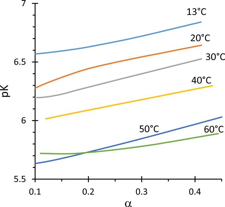 ZS-682-6 was studied by potentiometric titration at pH below 6.5, in the region of solubility (Fig. 3). pK of conjugated acid ionization of the imidazole units increases with increasing degree of ionization (α), because a decrease in the positive charge on the polymer chain hinders further elimination of protons from it. Increasing the temperature reduces the basicity of the imidazole units due to compactization of the macromolecules, which increases the electrostatic effect on the acid-base properties.