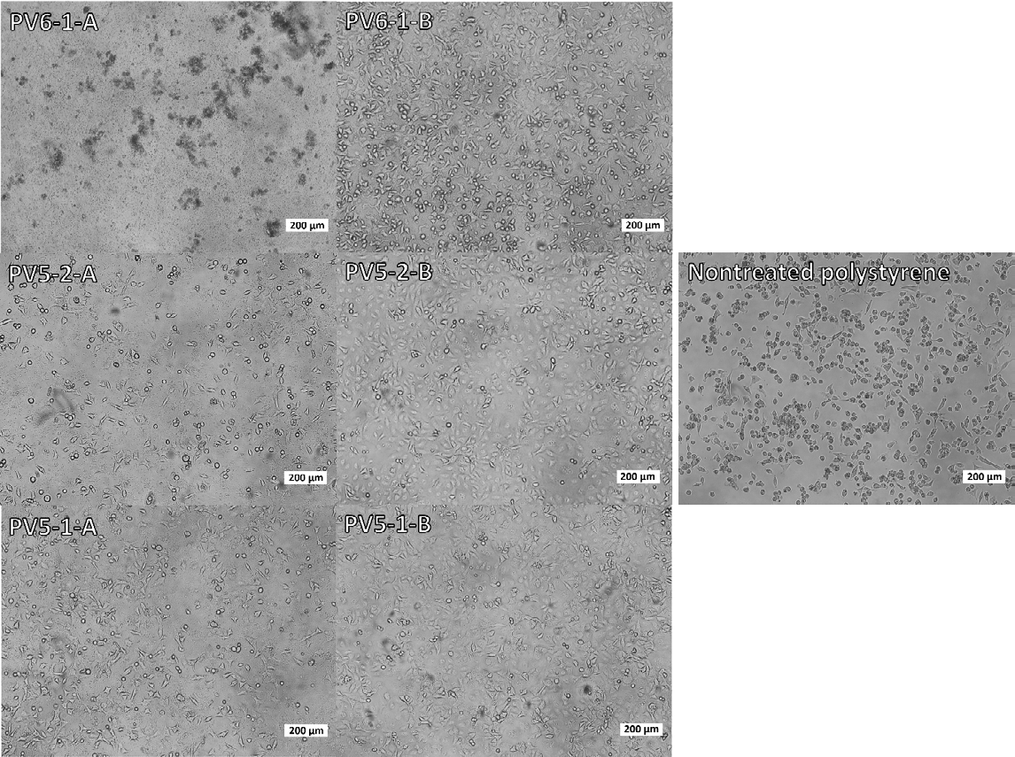 Fig.4. Adhesion of A549 cells to various substrates. Nontreated polystyrene showed poor adhesion, most cells are rounded. PV6-1-A didn’t show any cell adhesion at all while cells on a thinner PV6-1-B layer have a moderate adhesion and only some cells are unattached. Although cells attached and proliferated restrictively on the PV5-1-A and PV5-2-A thick polymer coatings, the PV5-1-B and PV5-2-B polymer substrates showed perfect cell adhesion and resulted in a cell monolayer, proving the suitability of their composition for cell culture.