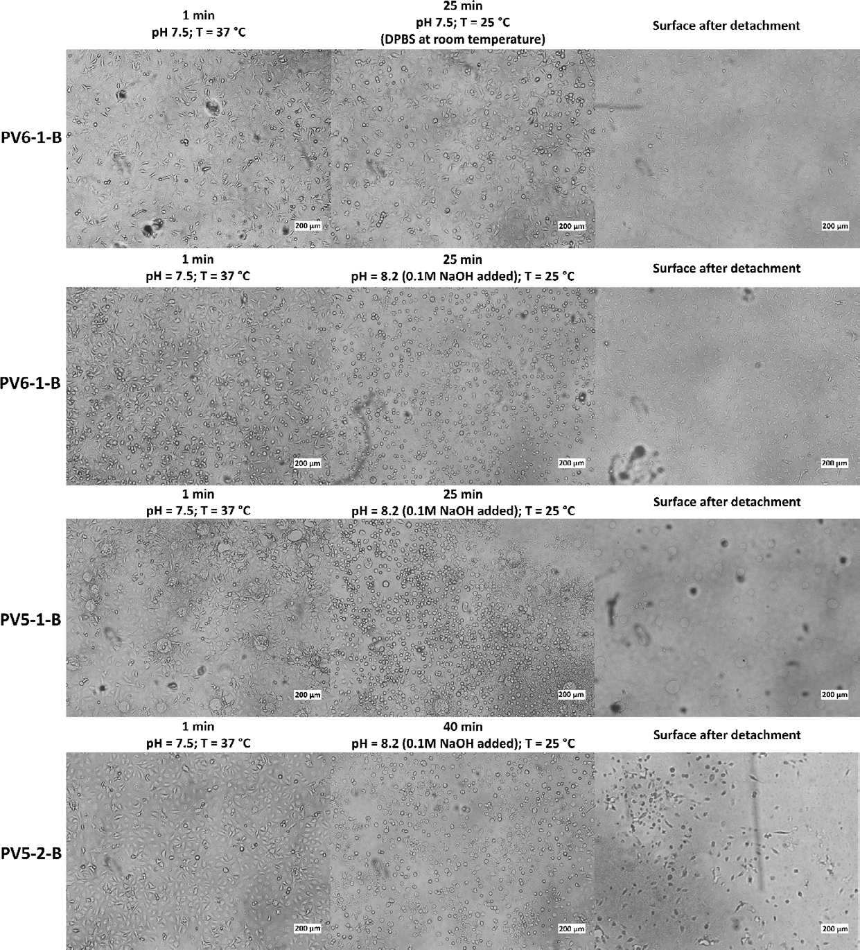 Response to the stimuli was examined by changing temperature by adding DPBS (DPBS temperature was similar to room temperature and corresponded to 25°C), or by simultaneously changing temperature by adding DPBS and increasing pH to 8.2 by adding 0.1 M NaOH solution. The PV6-1-B surface responded sufficiently to pH and temperature stimuli, and cells easily detached from the surface (Fig. 5). Moreover, using both stimuli, a change in pH and temperature, compared to a change in temperature, showed a significantly higher level of cell detachment, as can be seen by morphological changes from slight to complete rounding of the cells. The cells were then successfully detached from the surface. Although the PV5-1-B and PV5-2-Bsurfaces also showed some delamination in response to pH and temperature stimuli, it was limited to the center of the polymer coating, which may be due to the uneven thickness of the polymer layer, and cells are sensitive to the thickness of the cell layer.